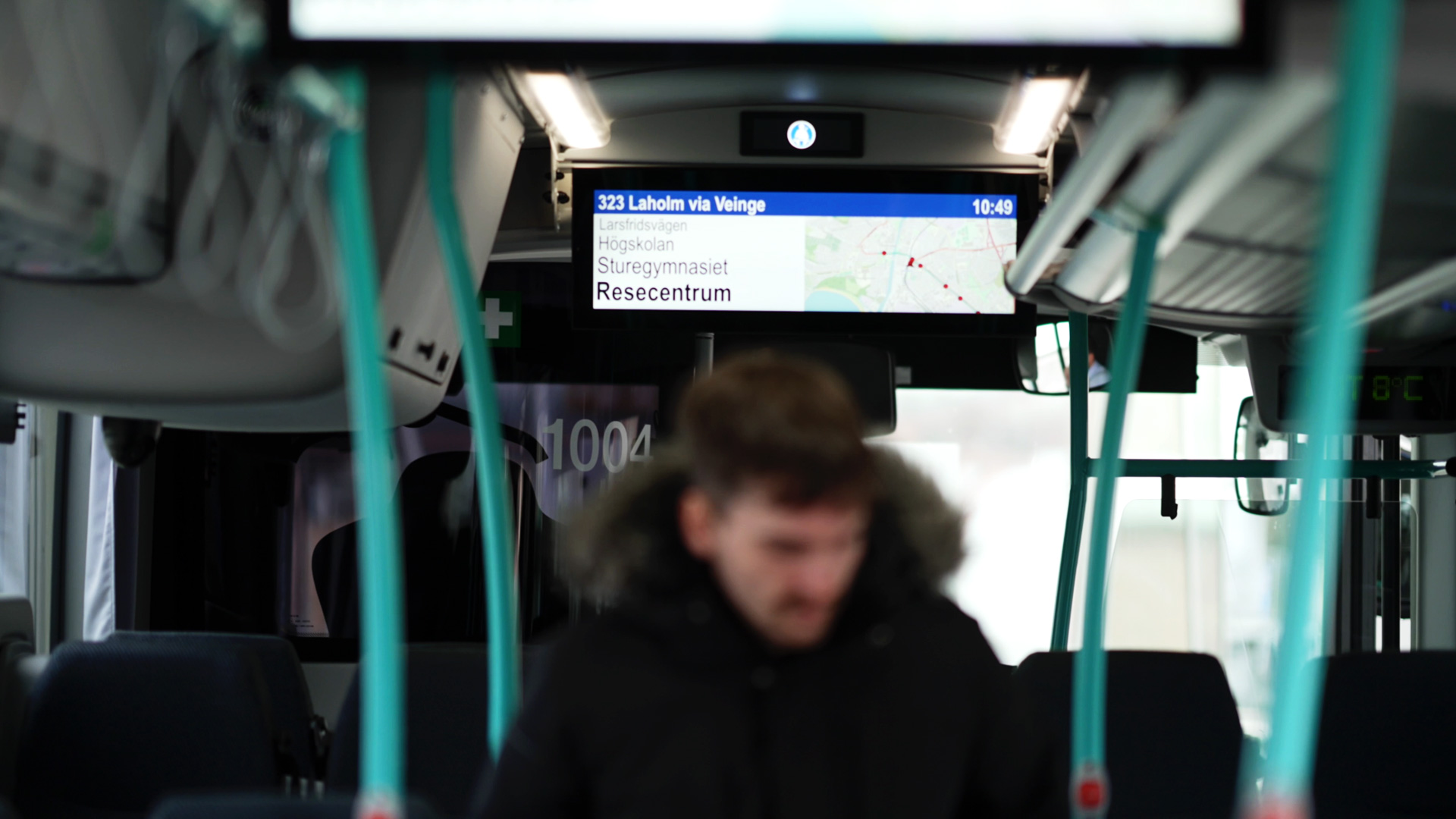 Hallandstrafiken’s vehicles are equipped with Thoreb’s D29 passenger information screens, which provide passengers with clear and up-to-date information about the next stop. The screens display real-time information, which means that they show the actual arrival time based on the current traffic situation rather than just the timetable (HLT only shows stop names and no times). This makes it easier for passengers to plan their journey and get updated information directly during the trip. The system also has audio announcements, which further improves accessibility for all passengers, including those with visual impairments.